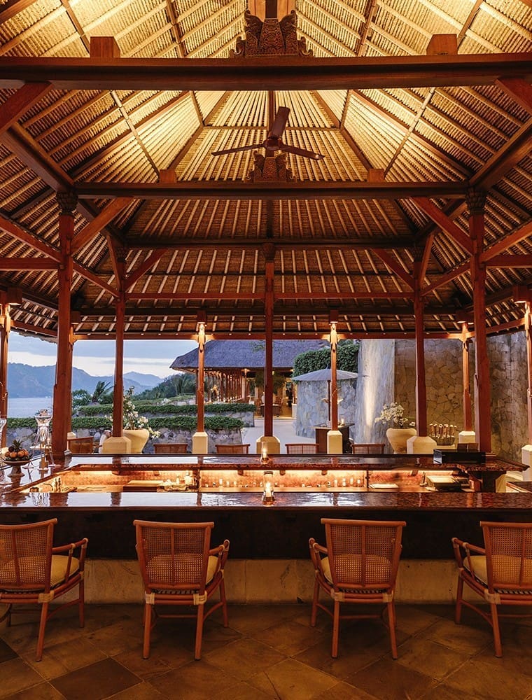 度假村遠離喧囂的觀光景點,腹地背靠阿貢山又能俯瞰龍目海峽。由建築大師Ed Tuttle操刀設計,用一系列向內彎曲的形狀並依山勢而建,崇尚與自然融合,又能兼顧客人最重視的隱私性。最具代表性的設計,就是如梯田般與海平面融為一體的三座無邊際泳池,任何時候眼睛都離不開蔚藍。