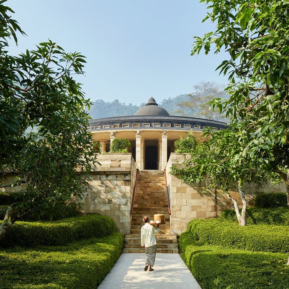 AMANJIWO由著名建築師Edward Tuttle所設計,其建築風格獨具一格。整體設計模仿了佛塔的結構,並巧妙地運用了巨石堆疊的手法,使來訪賓客能夠從全新角度欣賞這片婆羅浮屠美景。