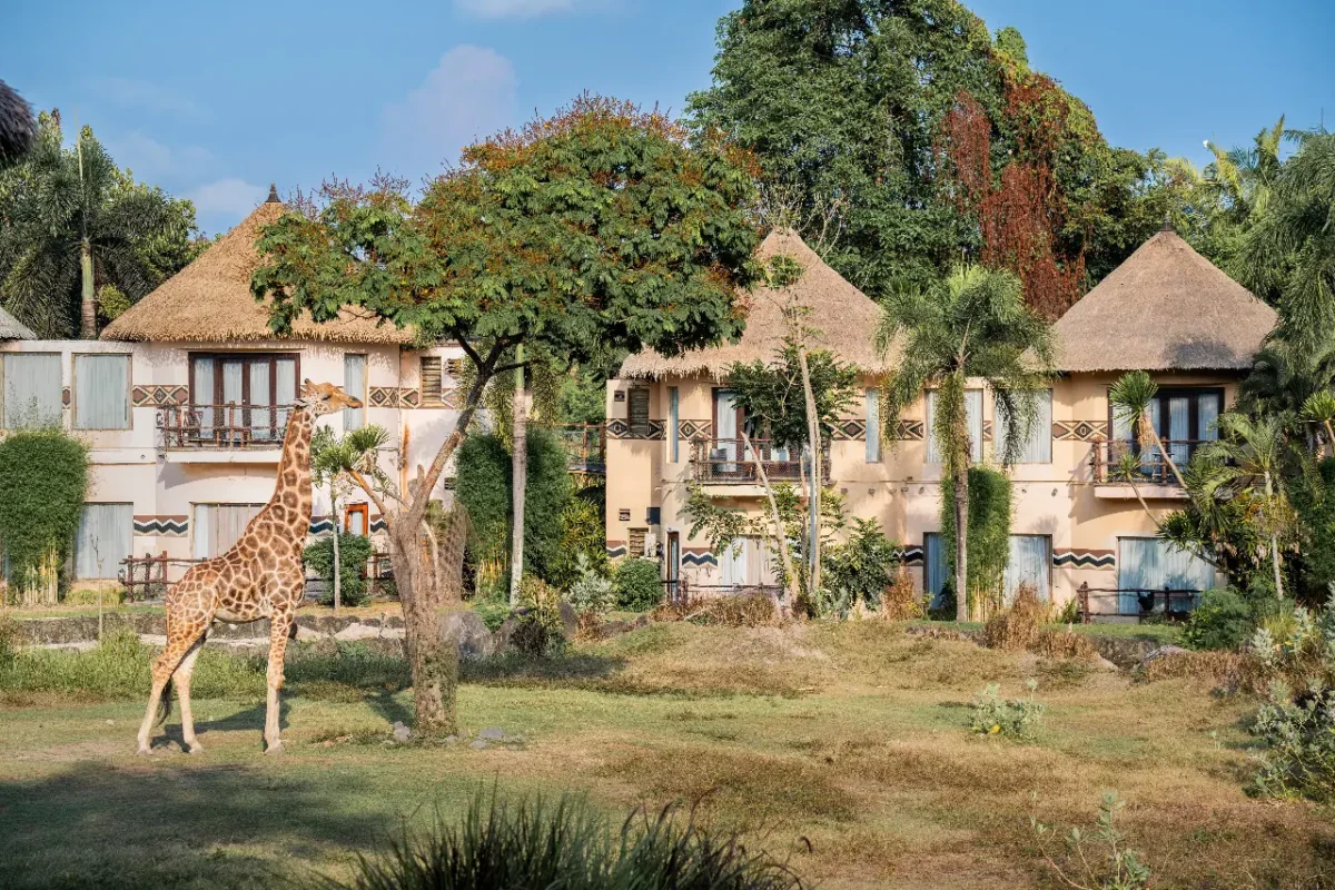 度假村坐落於峇里島野生動物園內,提供旅客近距離接觸野生動物的機會,例如斑馬、長頸鹿和犀牛。住宿選擇包括以非洲風格設計的草頂小屋,每間房間都可欣賞到野生動物自由活動的景觀。此外,度假村內設有餐廳、泳池和各種互動體驗,為家庭旅程增添難忘回憶。