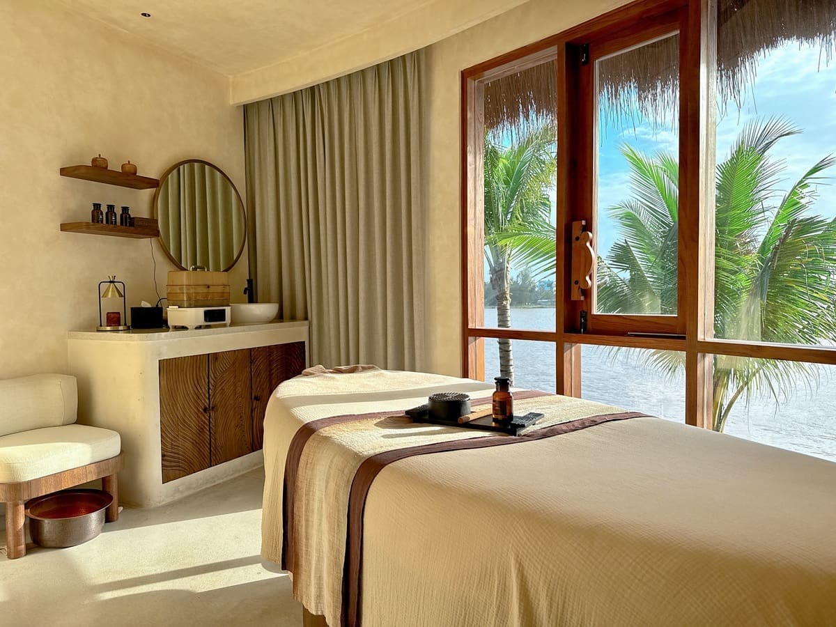 會安河畔Namia度假村以「SPA 全包式奢華度假村」聞名,入住即可享『每人每日一次 90 分鐘 SPA 療程』,先體驗 30 分鐘越式草本土耳其浴,再自由搭配 60 分鐘精油按摩、指壓舒緩或草藥球按摩,深層釋放旅途疲勞。河畔 SPA 中心被自然綠意與靜謐水景環繞,午後時光在微風與香氛中慢慢流動,讓身心徹底放鬆。