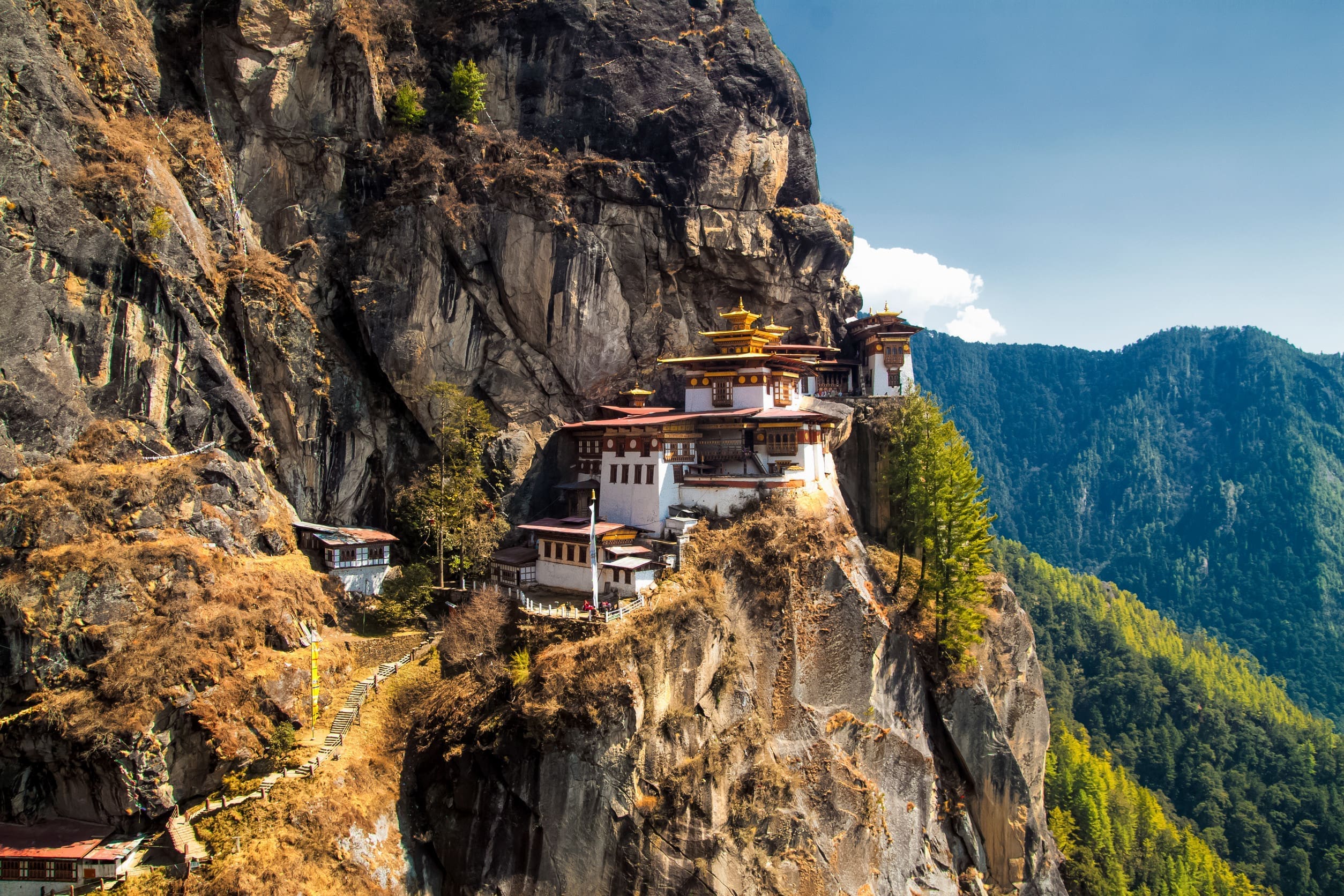 今天行程重頭戲“虎穴寺” – 不丹標誌性建築及最重要的文化之一,這座修道院建於高出帕羅(Paro)約2,950英尺的陡峭懸崖面,從山谷的底部可見。您的GEM將與您一同前往修道院並分享歷史故事。當穿過松樹森林,欣賞美麗的風景時。聆聽祈禱輪轉動的聲音,並繫好自己的五色經幡,讓風吹過祝福和祈禱。