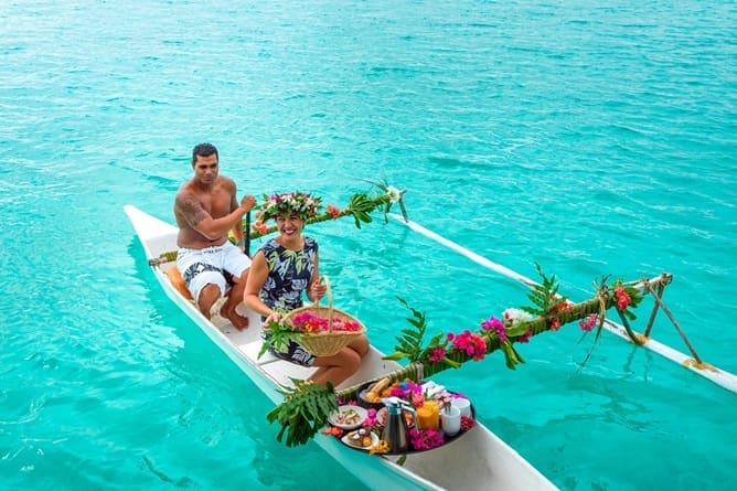 在大溪地體驗最夢幻的水上屋獨木舟早餐,由專業服務人員划著獨木舟將新鮮早餐送到私人水上別墅,享受奢華蜜月旅行的愜意早晨。旅客可一邊欣賞藍色潟湖全景,一邊品嚐道地大溪地美食,完美結合海島度假、浪漫行程與南太平洋體驗,打造獨一無二的夢幻住宿享受。